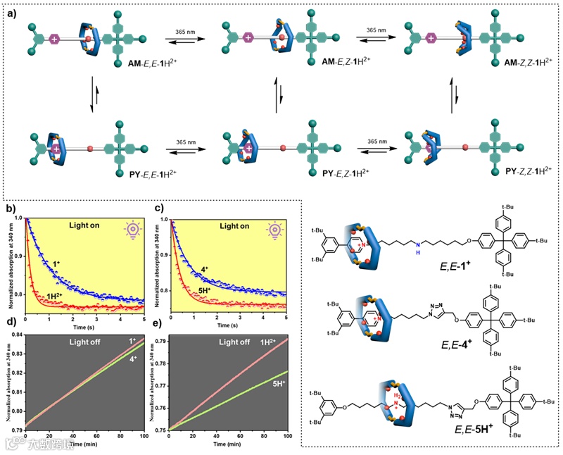 通过设计合成单一位点的对照轮烷并研究它们的光异构化行为,发现大环对不同结合位点显示出不同的光反应性,即位点会影响所结合大环的光稳态组成和光异构化速率(图3)。小