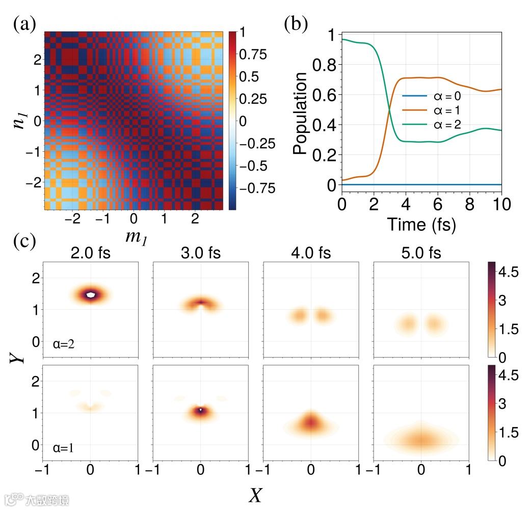 图2. (a) 无场情况下的电子重叠子矩阵, (b) 10 fs 内的基态和激发态的布局转移动力学,以及 (c) 激发态 (α = 1, 2) 通过锥形交叉的波包动力学。