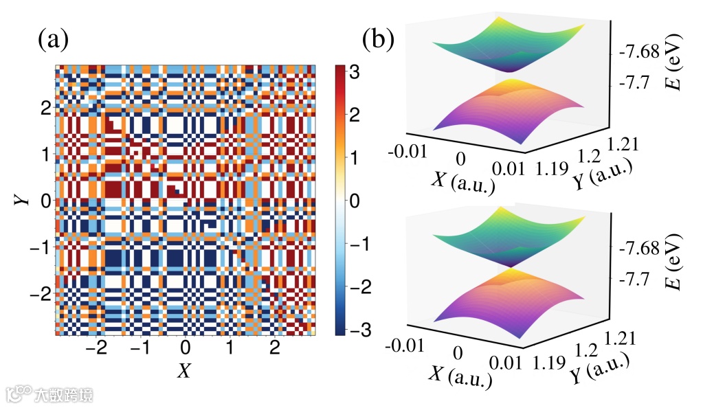 图3. (a) 磁场存在时电子重叠矩阵的随机相位, (b) 有磁场(上图)和无磁场(下图)时 CI 周围的绝热势能面,磁场在原始 CI 处打开了一个间隙。