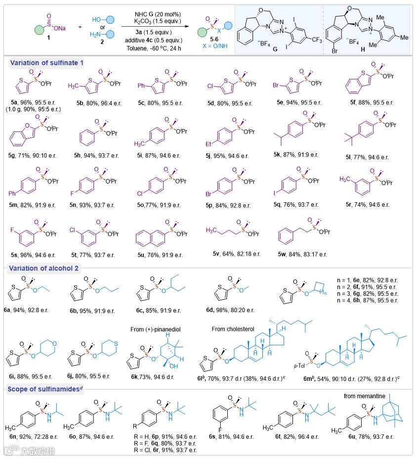 的合成,但立体选择性略有降低。接下来,作者还探索了一系列醇,如乙醇、正丁醇、3-戊醇、环状醇及含杂原子环状醇,都能以优异的收率和立体选择性获得相应的手性亚磺酸酯产物(