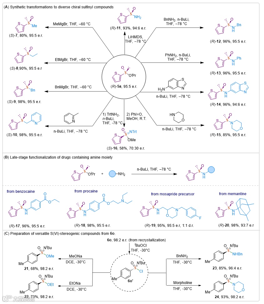 利用该方法所制备的手性硫化物为进一步转化提供了条件。例如,与各种格氏试剂的亲核加成得到高产率和立体选择性的亚砜产物(