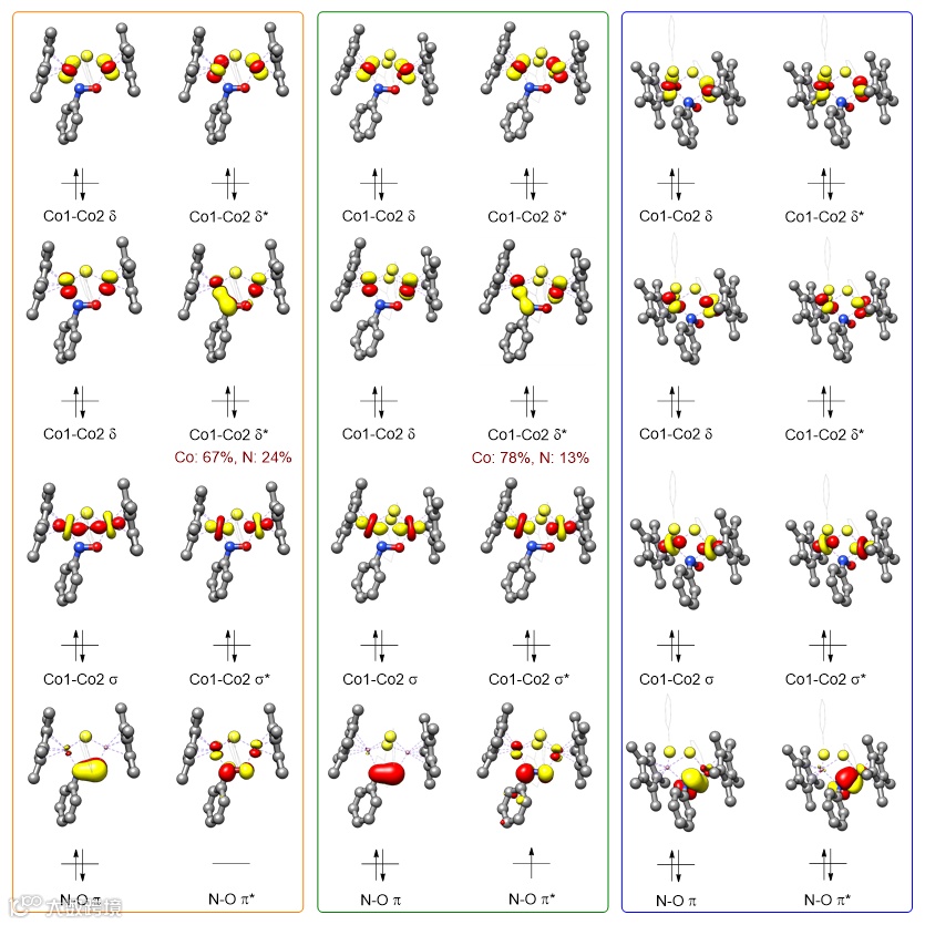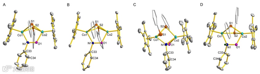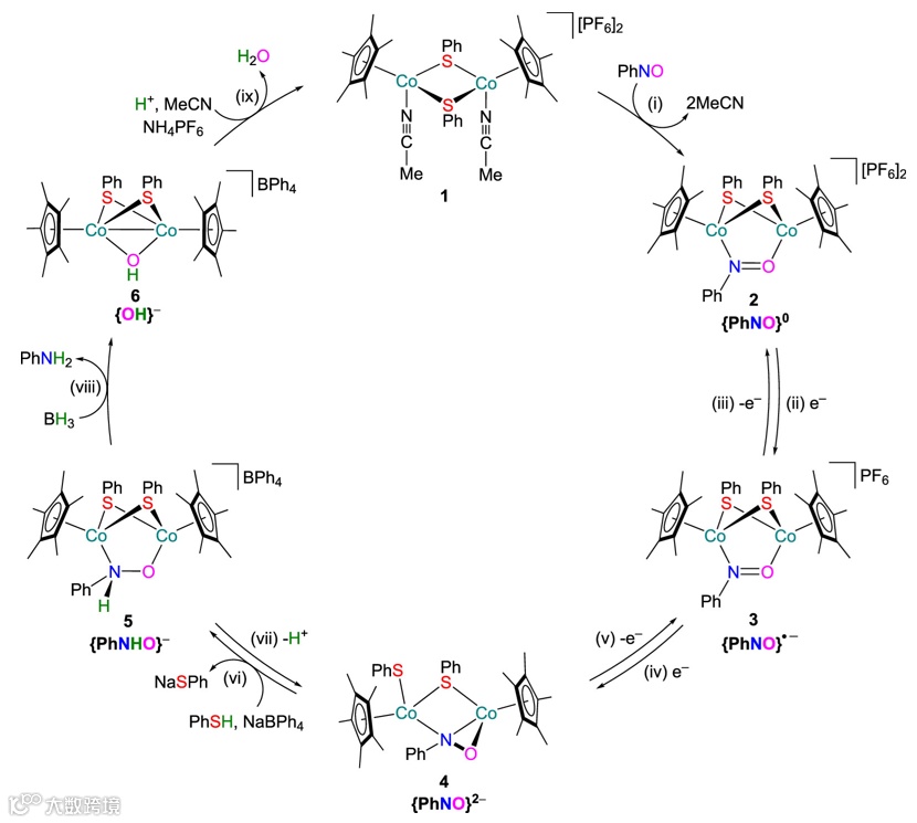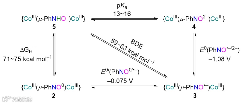 综上所述,通过理性设计双金属功能配合物,成功在一个体系内实现了PhNO三种不同氧化态之间的可逆转化,并模拟了PhNO逐步四电子还原转化为PhNH2的全过程。同时,分离并详细表征了一例罕见的双钴PhNHO−配合物,并通过实验化学获得了一系列重要的热力学数据。上述研究结果为从分子层面系统认识PhNO生物还原代谢过程提供了重要的功能模型。