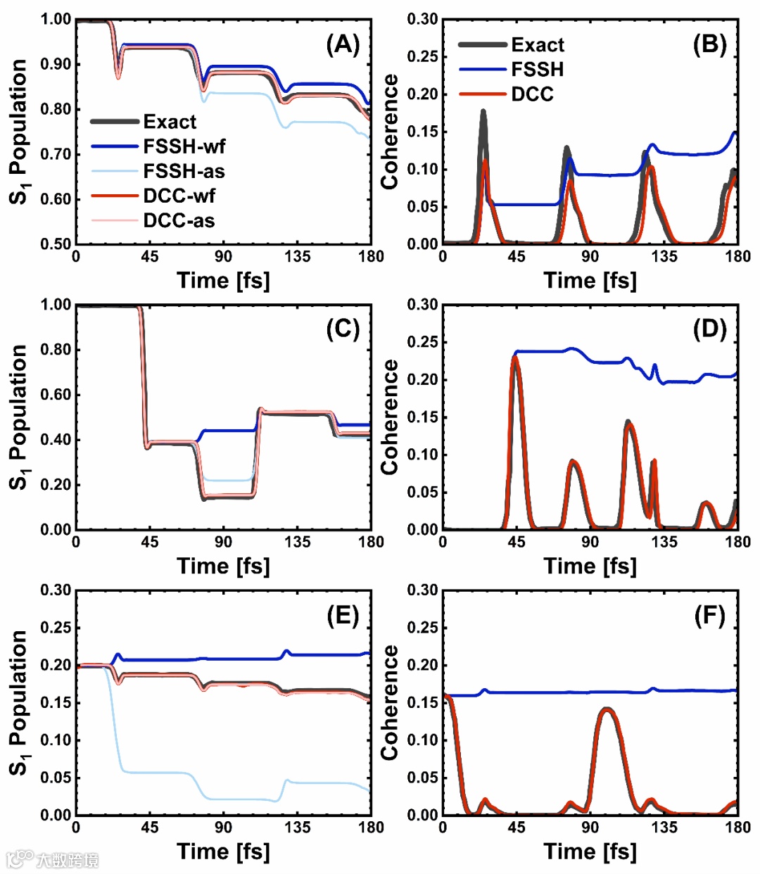 图2. (A, B)BS-1模型、(C, D)BS-2模型和(E, F)BS-3模型的激发态布居和相干随时间的变化。黑线表示精确的全量子动力学结果。在(A, C, E)图中,FSSH-wf、FSSH-as、DCC-wf和DCC-as的结果分别由蓝色、浅蓝色、红色和浅红色线表示。在(B, D, F)图中,FSSH和DCC的结果分别由蓝色和红色线表示。