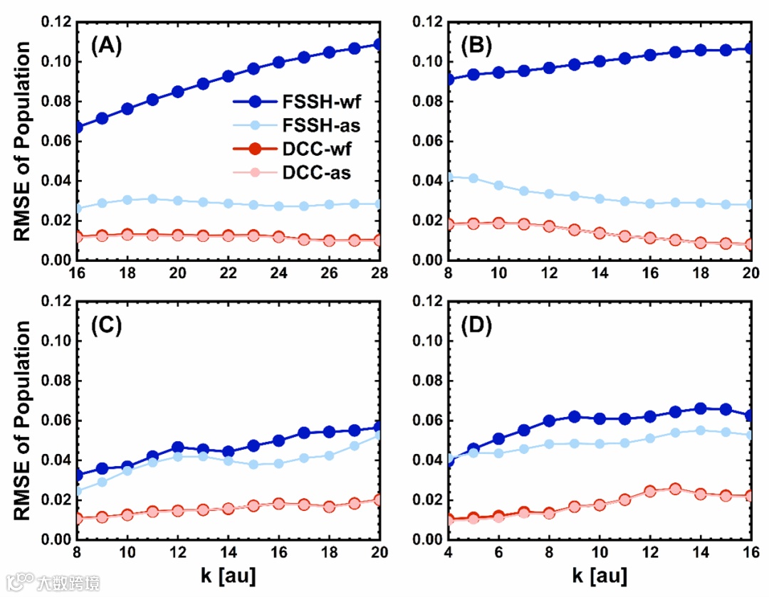 图1. 初始从(A)基态和(B)激发态出发,STD-1模型在不同初始位置和入射角下的布居均方误差与初始动量之间的关系。初始从(A)基态和(B)激发态出发,STD-2模型在不同初始位置和入射角下的布居均方误差与初始动量之间的关系。FSSH-wf、FSSH-as、DCC-wf和DCC-as的结果分别由蓝色、浅蓝色、红色和浅红色实心圆表示。