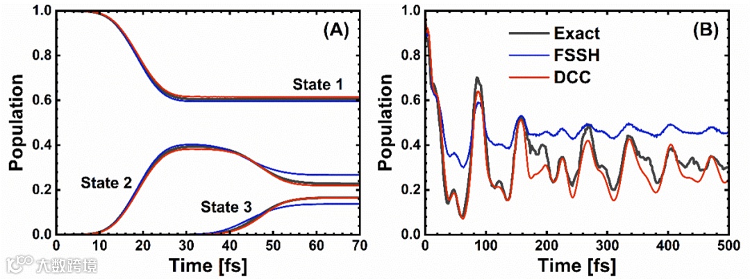 图 3. (A)一种光解模型中所有透热态的布居随时间的变化,(B)三维吡嗪模型中透热2态布居随时间的变化。黑线表示精确的全量子动力学结果,FSSH和DCC 分别由蓝线和红线表示。