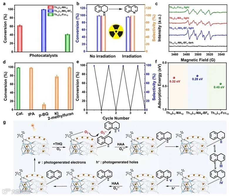 。它们的催化活性与γ射线照射前的活性相当,这意味着这些钍簇有望成为未来需要暴露在电离辐射条件下的催化剂。在这些反应中,每个钍簇的催化活性各不相同,这与第二配体的加入密切相关,表明“双配体工程”策略确实是一种具有吸引力的调控催化活性的方法。此外,实验和理论计算表明在这些反应中,钍氧核和配体协同催化,以实现底物分子的有效转化。