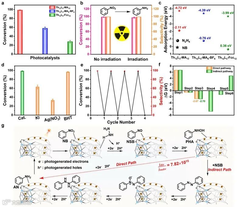 )照射后没有显著变化。这些功能化的耐辐射的钍簇被成功应用于还原反应(光催化硝基苯还原)和一些氧化反应(光催化N-杂环氧化脱氢和热催化二苯甲烷氧化)