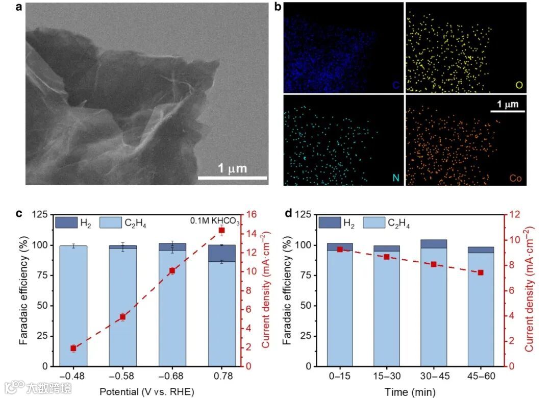 (a)和 (b) CoPc/rGO 的 SEM 图像; (c) CoPc/rGO 在 TCE 饱和的 0.1 M KHCO3 中的电化学脱氯性能; (d) CoPc/rGO 催化的 TCE 脱氯稳定性。