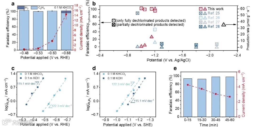 (a) CoPc/CNT 在 0.1 M KHCO3 溶液中的电化学 TCE 脱氯性能;(b) CoPc/CNT 与其他催化剂之间 TCE 脱氯选择性和乙烯产率的比较;(c)和(d) 不同 pH 值下 CoPc/CNT 催化 TCE 还原生成乙烯的 Tafel 曲线 (RHE(c)和 SHE(d)); (e) CoPc/CNT 在 −0.64 V 下在 0.1 M KHCO3 中催化的 TCE 脱氯稳定性。