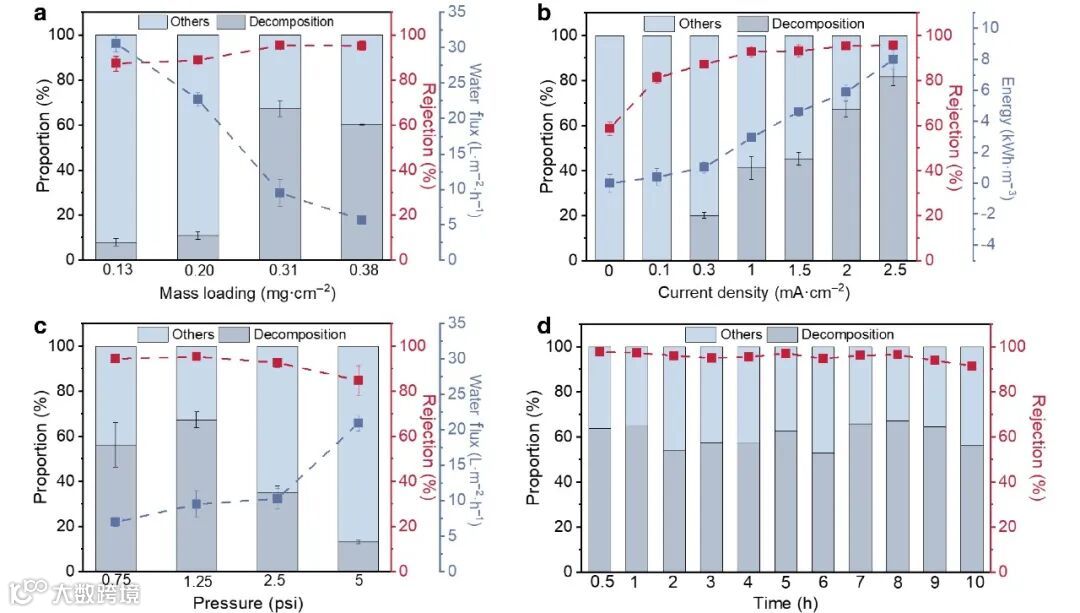 图4. 通过CoPc/rGO@Nylon 膜以电化学方法处理水中TCE污染物的性能:(a)催化剂负载量 TCE 截留率、分解比例和水通量的影响 (工作电流密度为 2 mA·cm−2,跨膜压差为 1.25 psi);(b)当催化剂质量负载量为 0.31 mg·cm-2 且跨膜压差为 1.25 psi 时,电流密度对 TCE 截留、分解和能耗的影响;(c) 跨膜压差对 TCE 截留、分解部分和水通量的影响(催化剂质量负载为 0.31 mg·cm−2,电流密度为 2 mA·cm−2);(d) 过滤膜的稳定性性能。