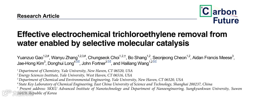 Yuanzuo Gao, Wanyu Zhang, Chungseok Choi, Bo Shang, Seonjeong Cheon, Aidan Francis Meese, Jae-Hong Kim, Donghui Long*, John Fortner*, Hailiang Wang*, Effective electrochemical trichloroethylene removal from water enabled by selective molecular catalysis, Carbon Future 2024, 1, 9200015.