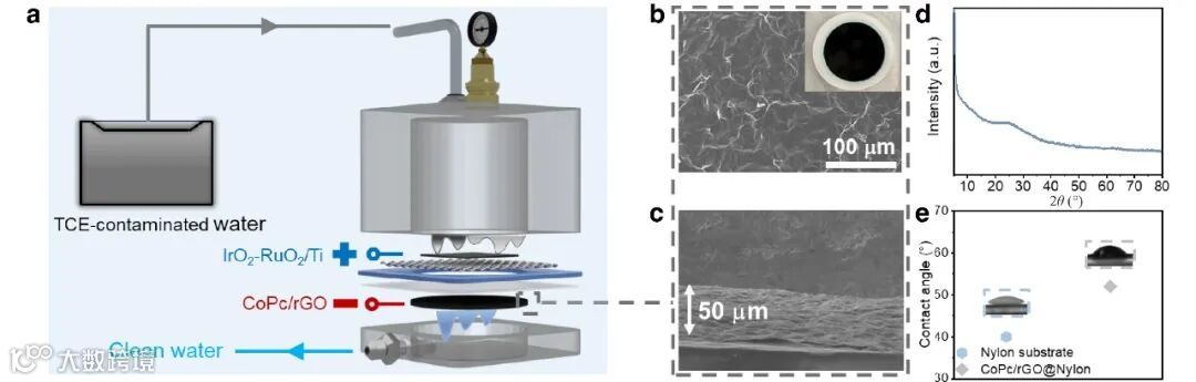 (a) 电化学膜过滤装置示意图; (b)和(c) SEM 图((b)为俯视图, (c)为侧面横切图); (d) CoPc/rGO 膜的XRD图;(e) CoPc/rGO@Nylon和Nylon的水接触角。