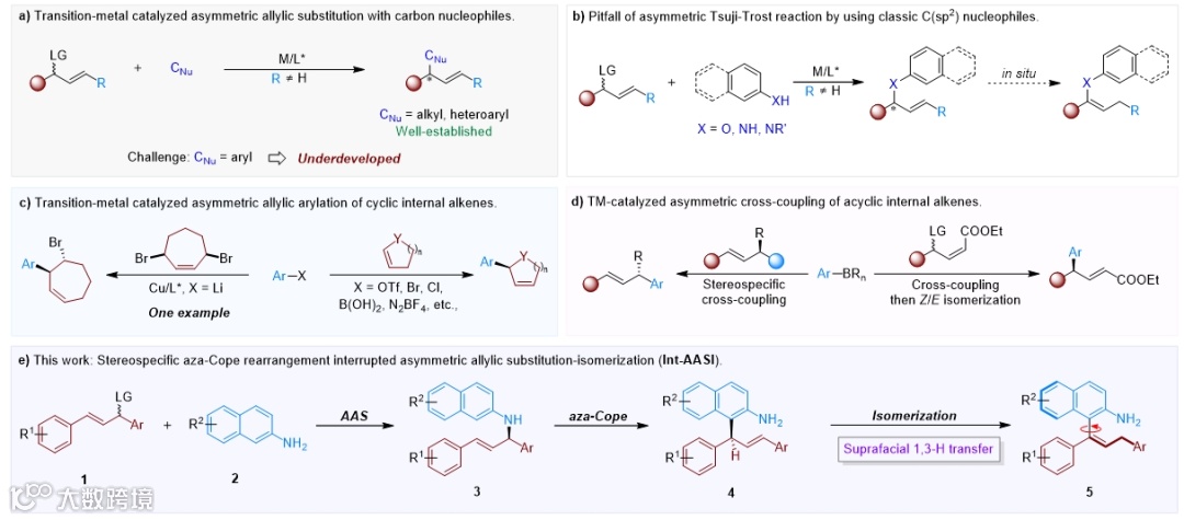 过渡金属催化烯丙基取代反应构建C-C键是一类经典的化学反应,其中反应的亲核试剂主要局限于烷基或杂芳基亲核试剂。然而,针对于芳基亲核试剂与内烯烃亲电试剂的烯丙基取代反应则罕有报道。这主要可能是因为传统的萘胺与萘酚类亲核试剂具有双亲核位点,因此容易发生烯丙基胺化和醚化反应。目前,不对称烯丙基芳基化反应主要通过(立体特异性)交叉偶联实现,但是过渡金属催化的开链内烯烃与芳基亲核试剂诱导的不对称烯丙基芳基化反应仍具挑战。