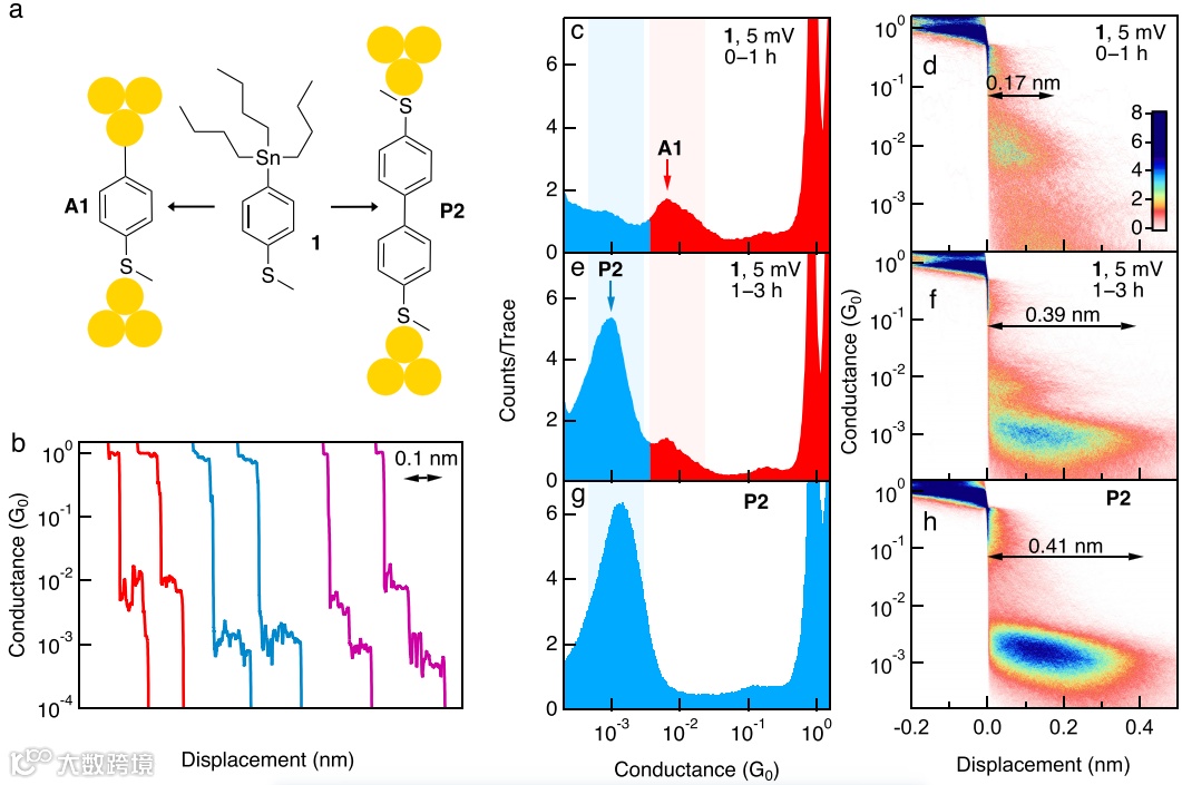 进行了电导测量,发现了两种导电状态:高导电状态与Sn基团断裂后形成的Au-C共价键有关,低导电状态则对应C-C偶联反应生成的联苯衍生物。42%的测量轨迹显示了从高导电到低导电状态的转换,说明在分子结形成时,C-C偶联反应可以同步发生。