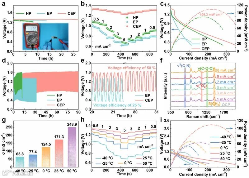 图3. 由CEP电解质和Ce-CoO催化剂组装FZAB的电化学性能。