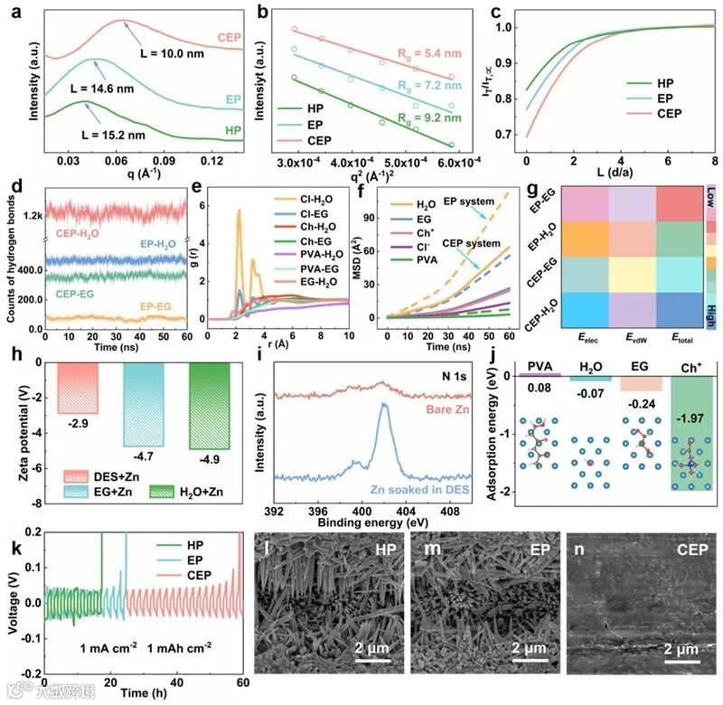 图1. (a-g) 不同凝胶的理化性质及分子动力学模拟。(h-n) 低共熔凝胶与锌阳极的兼容性表征、电化学测试和相互作用能计算。