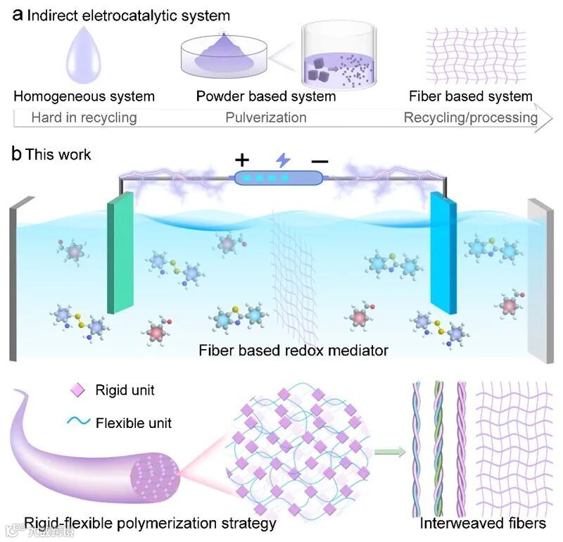 聚合物纤维是一种来源于自然并被人类掌握的细长材料,已广泛应用于纺织、建筑、医疗保健、汽车或航空航天等领域。如果可以整合独特的电催化功能,聚合物纤维也将是间接电催化中氧化还原介体的理想候选物,这可能实现可加工、可循环和有效的非均相间接电催化系统,对于真正的催化场景如流动床催化或工业规模生产具有很大的潜力。此外,聚合物纤维的柔性或刚性等性质也很重要,因为它们与电催化过程中的耐久性密切相关,而由于多功能材料设计的困难,它们之间的平衡仍然是一个巨大的挑战。