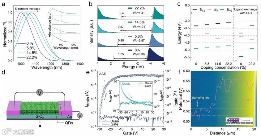 在最佳掺杂量为22.2%(K/Ag)时,KAAS量子点的Femi能级被微调到价带附近,并在场效应晶体管(FET)器件中显示出典型的p-type传输行为。第一性原理计算表明,