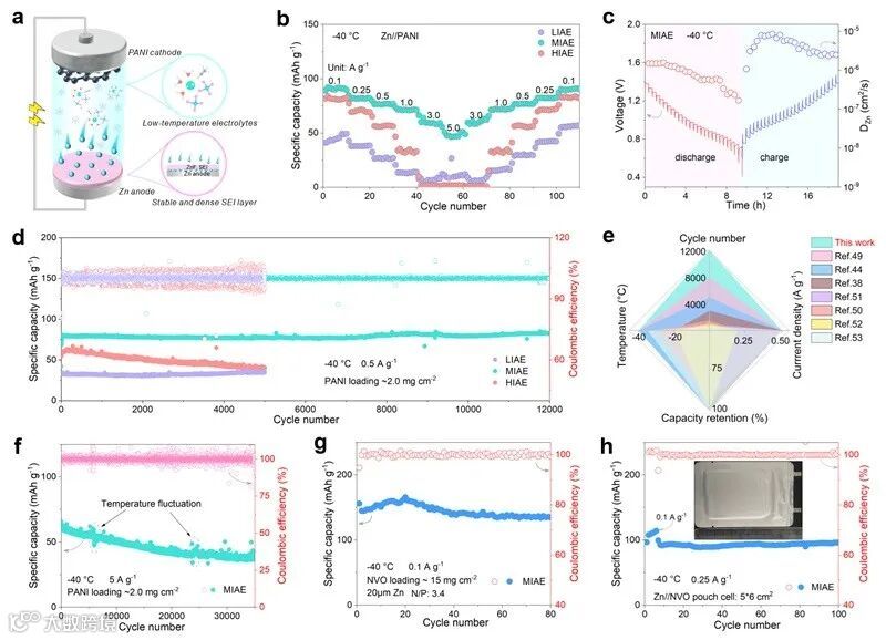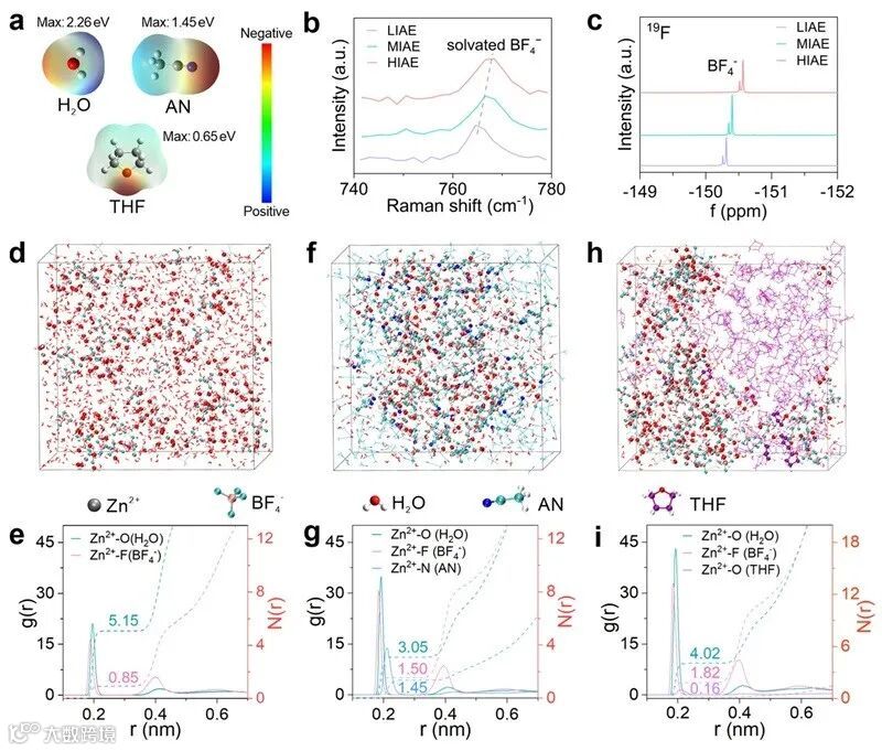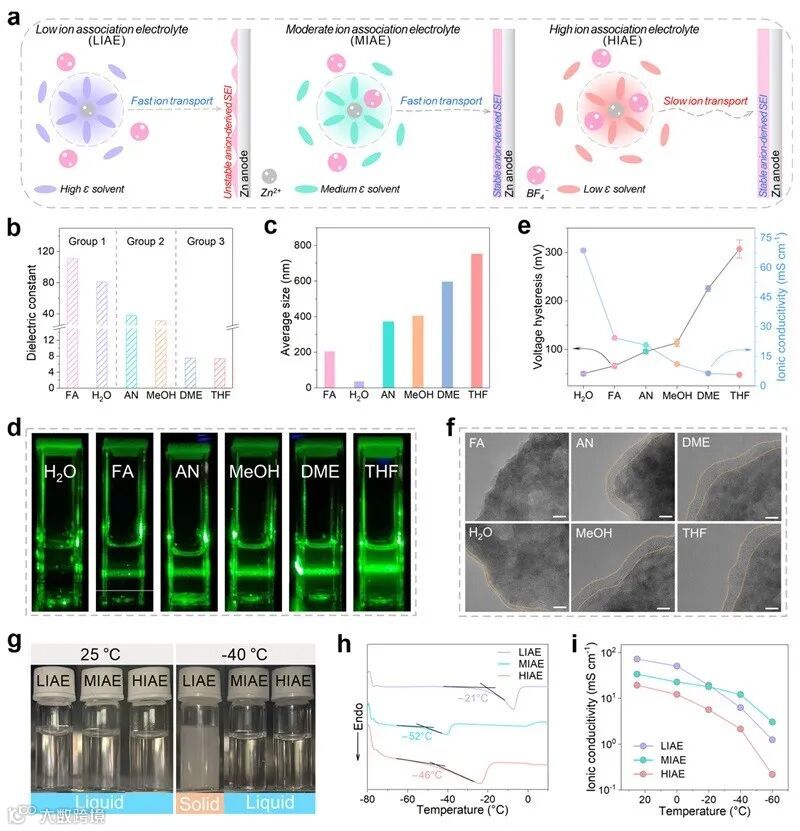 溶剂的介电常数(ε)是调节电解液中阴阳离子相互作用的关键参数。高ε的溶剂有利于盐的解离,促进电解液体相中快速的离子传输。而低ε的溶剂有利于增强阳离子-阴离子相互作用,促进负极侧阴离子衍生的SEI形成。因此,具有中等ε溶剂的电解液可能平衡体相中快速的Zn2+传输和锌负极界面处由阴离子衍生的SEI形成,平衡的电解液设计理念如图1所示。作者通过一系列实验测试验证了这一猜想。为进一步研究阴阳离子缔合强度对低温锌沉积/剥离性能的影响,作者选用H2O(高ε)、AN(中ε)、THF(低ε)三种溶剂分别制备低离子缔合电解液(LIAE)、中等离子缔合电解液(MIAE)和高离子缔合电解液(HIAE)并探究其低温性能差异。