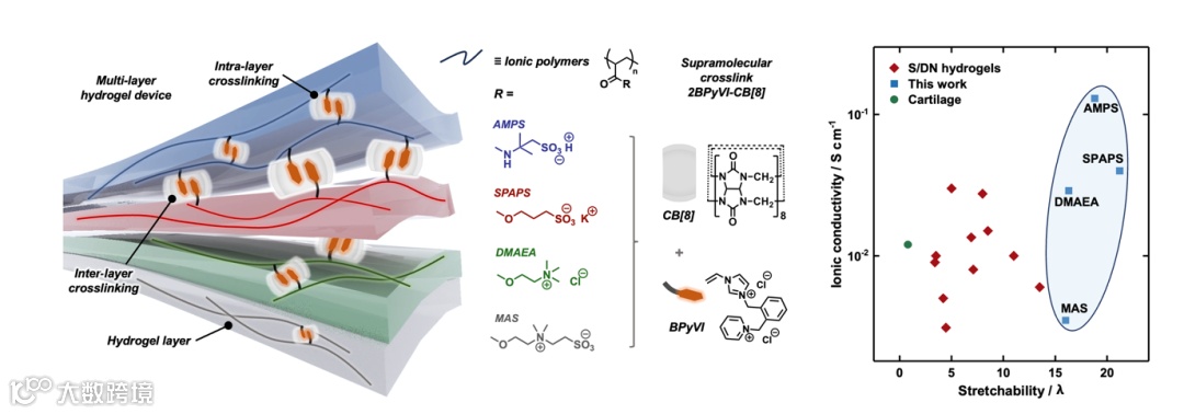 多层水凝胶之间能够紧密粘合,是因为作者使用了被称为葫芦脲的桶状分子,这些分子就像分子手铐,可在不同层之间形成可逆的化学键。分子手铐提供的层间强粘附力使果冻电池可以拉伸,不会分离,更重要的是,不会失去导电性。