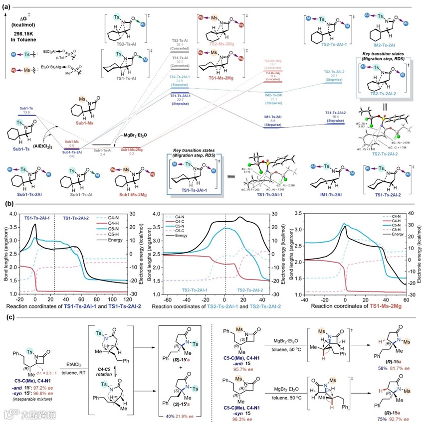 作者通过计算化学和实验相结合的手段,对模型底物发生H迁移和烷基迁移的反应机理进行了深入研究。结果表明,在强Lewis酸EtAlCl2条件下发生的H迁移和烷基迁移都具有明显的分步(stepwise)性质,且产生分步的位点不同:其中H迁移反应中的最后一步C5−N关环明显滞后,由此产生了C5位的碳正离子;而烷基迁移过程则是起始时首先发生了C4−N键的断裂产生了C4位的碳正离子。与之形成鲜明对比的是,在相对更弱的Lewis酸MgBr2•Et2O条件下发生的H迁移则是一个协同异步(asynchronous concerted)过程。作者进一步通过手性底物反应前后的ee值变化验证了上述计算结果的合理性。