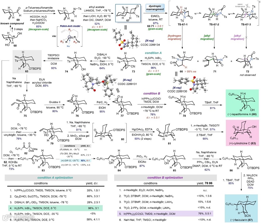 最后,作者以商业可得的手性源作为起始原料,通过简单转化得到β-内酰胺67,以H迁移dyotropic重排反应作为关键步骤,高效完成了5/6螺内酰胺结构66的构建;随后,通过对C13位进行官能团化得到关键中间体65。以该化合物为起点,分别通过RCM反应、aza-Michael反应和氮丙啶中间体介导的扩环反应为关键步骤,发散式地完成了三环海洋生物碱(–)-lepadiformine A、(+)-cylindricine C、(–)-fasicularin的不对称全合成,充分展现了上述重排反应的实用价值。