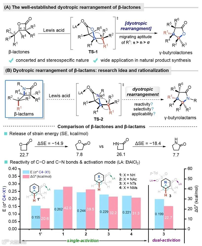Dyotropic(双向)重排是一类独特的周环反应,至今已有超过50年的发展历史。其中,Lewis酸促进的β-内酯双向重排反应因其广泛的合成应用价值而受到高度关注。自上世纪70年代Mulzer等人首次发现该反应以来,Reetz、Black、Cossío、Romo及唐叶峰等课题组陆续对该反应进行了深入研究,将其发展为一种构建多取代γ-丁内酯及其相关结构单元的高效合成工具。然而,作为β-内酯的氮杂等价物——β-内酰胺的dyotropic重排反应至今尚未有报道。究其原因,虽然从热力学角度来说,β-内酰胺扩环生成γ-内酰胺的过程相比于β-内酯的扩环反应更加有利(可释放出更大的环张力),但计算化学表明,在Lewis酸促进的“单活化”模式下,β-内酰胺dyotropic反应的活化能远高于β-内酯dyotropic反应的活化能,因此从动力学角度来看,前者在常规条件下难以发生。