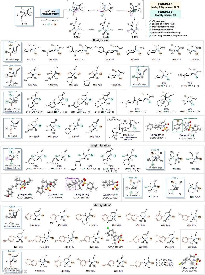 作者首先以环己基取代的β-内酰胺作为模型底物进行了条件的筛选,发现N-Ms-β-内酰胺/MgBr2•Et2O以及N-Ts-β-内酰胺/EtAlCl2两种最优底物和反应条件组合。以此为基础,作者对该反应的底物适用范围进行了系统考察,并根据发生迁移的基团性质不同,将所有底物分为了H迁移、烷基迁移、芳基迁移三个大类。值得注意的是,所有烷基迁移和芳基迁移的dyotropic重排反应都展现了优异的立体专一性,作者推测该芳基迁移过程可能是通过苯鎓离子中间体进行的。