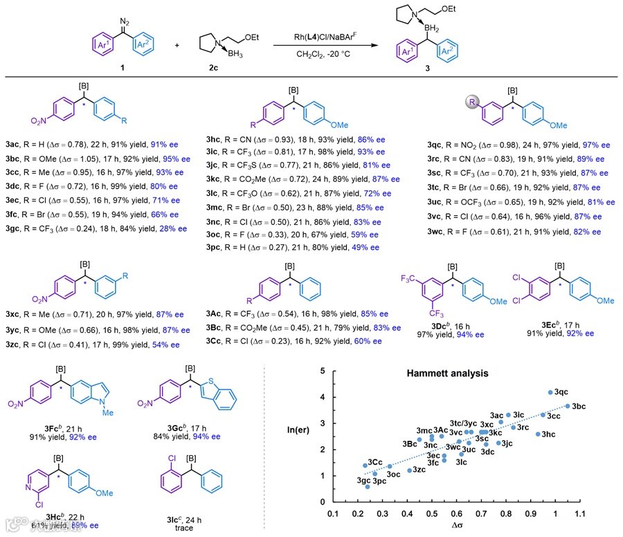 图3. B-H键插入反应底物普适性考察及Hammett分析