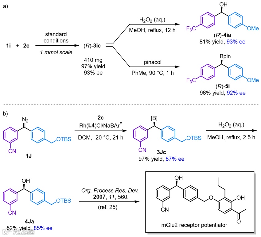 为了展示合成方法的应用价值,作者进行了放大合成及产物衍生化实验(图4),产物可以方便地转化为相应的偕二芳基甲醇和偕二芳基甲基硼酯。其中,偕二芳基甲基硼酯是一类非常有用的中间体,可进一步用于多种转化反应。此外,作者还成功地进行了mGlu2受体增强剂关键手性中间体偕二芳基甲醇