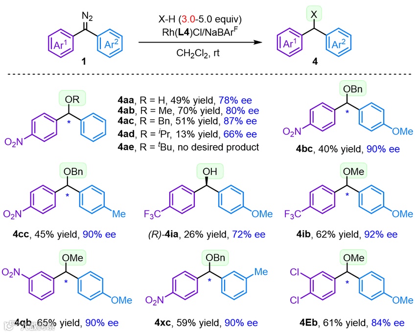 设计构象限制的新型阳离子铑/手性双烯催化剂,进一步拓展了一价铑/手性双烯催化体系,利用二芳基卡宾中两个取代芳基的电性差异,成功实现了二芳基铑(I)卡宾对B-H和O-H键的不对称插入