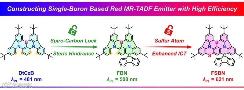 独特且简便的螺碳锁定和硫嵌入策略,旨在构建具有优异色纯度和高效率的红光MR-TADF材料。