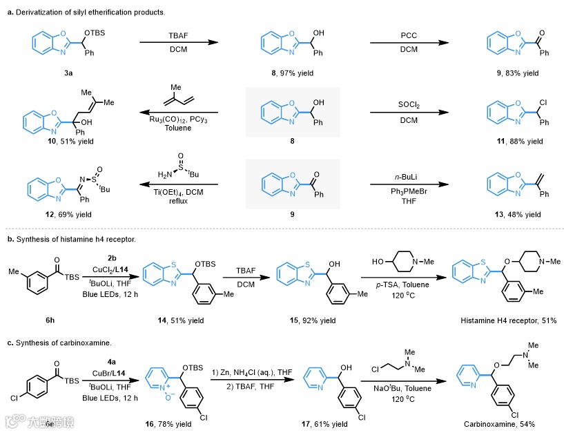 随后作者通过一系列衍生化实验证实该反应的实用性。利用发展的方法学可以成功实现药物活性分子Histamine h4 receptor ligand和Carbinoxamine的合成。