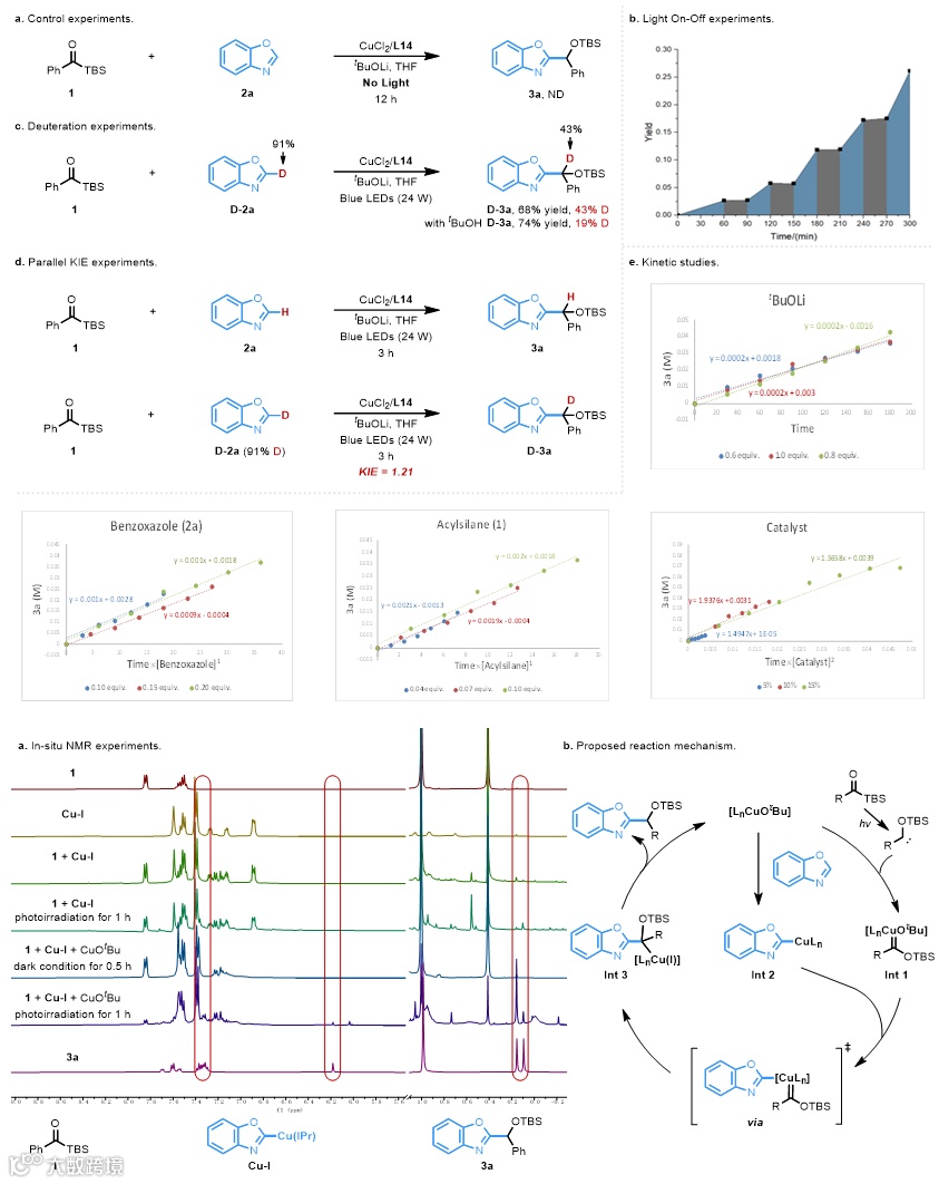 为了深入理解反应的机理,作者开展了一系列机理实验研究。通过平行动力学实验表明苯并噁唑C–H键活化未参与反应的决速步骤,通过开关灯实验,表明反应未经历自由基反应途径。通过动力学实验,该反应对于酰基硅底物(