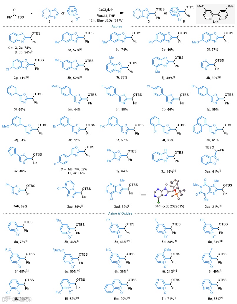 在确立最优反应条件后,作者进一步考察了其它类型的芳杂环底物。对于苯并噁唑芳环上含有各种类型的取代基,以及苯并咪唑和苯并噻唑底物都能取得良好的结果;该反应同样对于噁唑以及单取代和双取代的噁唑都能很好的兼容;对于其它类型的杂环如异噁唑、噁二唑、嘌呤、咖啡因以及不同类型的氮氧化合物等也能取得中等到良好的收率。