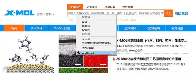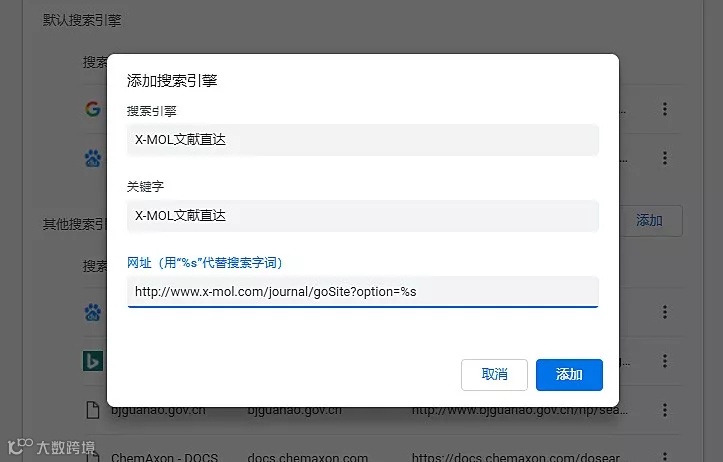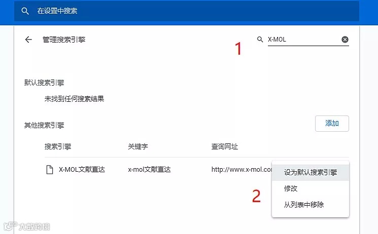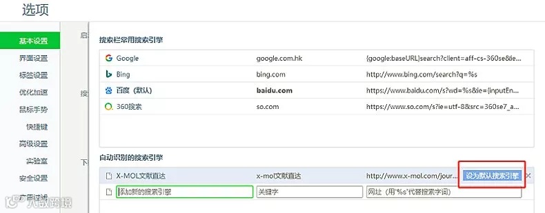 ,将“X-MOL文献直达”设为默认搜索引擎(如下图2),完成设置。