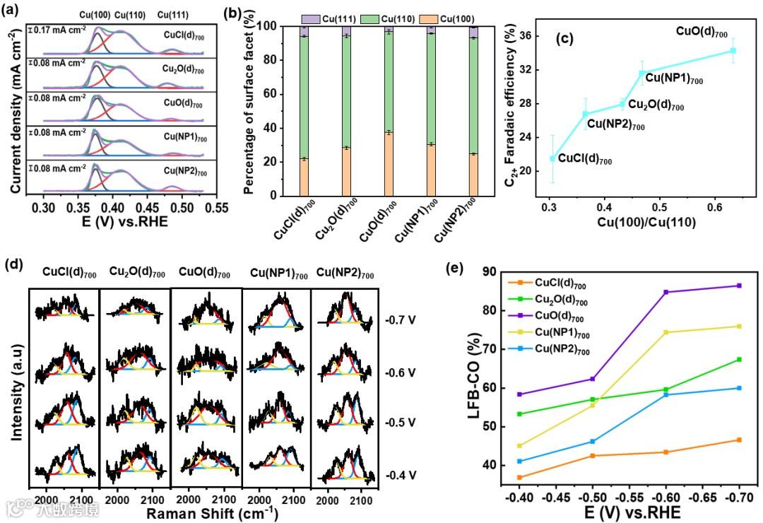该工作利用*OH 吸附和原位拉曼光谱证明,C2 产物的选择性与铜催化剂中Cu(100) 百分比有关。更为重要的是,该分析是基于不同类型铜催化剂的统一质量输运条件进行的,它前所未有地统一了局部 pH 值、电流密度和电位的影响,该发现为进一步设计高效催化剂提供了理论指导。