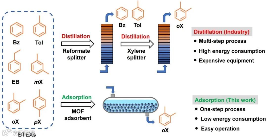 图1. 邻二甲苯在工业分馏和吸附萃取过程的对比示意图。
