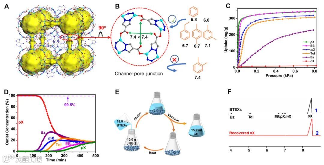 图2.(A)JNU-2通道-孔互连的3D网络结构以及康诺利表面示意图;(B)通道-孔连接处开口的特写视图,突出显示对角线的孔径以及BTEXs分子动力学直径;(C)在353K条件下,