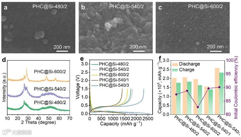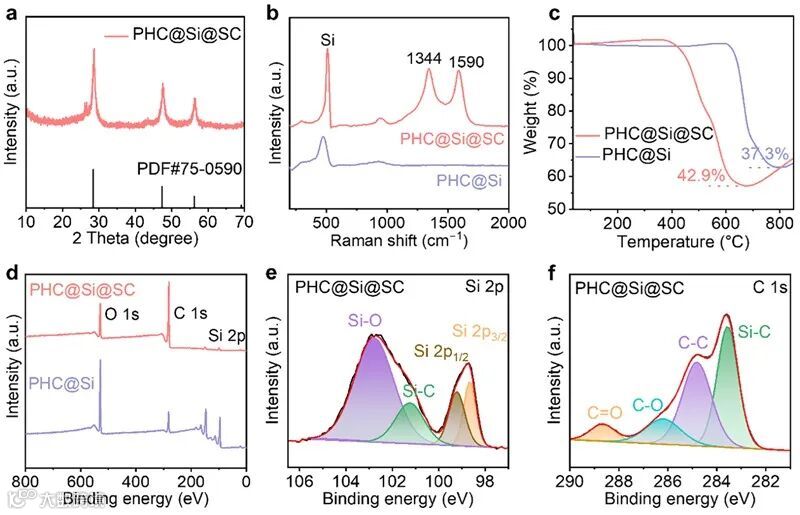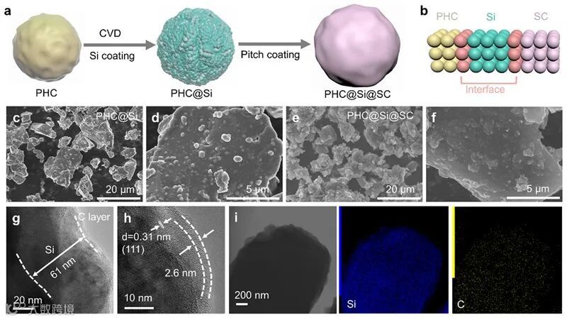 通过CVD和随后的煅烧方法成功地制备了PHC@Si@SC样品。首先,在PHC@Si的制备过程中,研究了不同硅烷沉积时间和温度下容量和ICEs的变化规律。所选的PHC@Si样品表现出2058 mAh g−1的放电容量和88.8%的ICE。其次,沥青衍生的软碳层被引入以进一步提高循环性能。PHC起到支撑结构的作用,SC起到抑制体积膨胀的作用。因此,该硬碳和软碳共保护的PHC@Si@SC阳极材料提供了1625 mAh g−1的高容量和86.8%的高ICE。此外,PHC@Si@SC|| NCM811全电池表现出出色的循环性能。PHC@Si@SC复合材料的设计为实现具有良好电化学性能的硅碳负极材料奠定了基础。