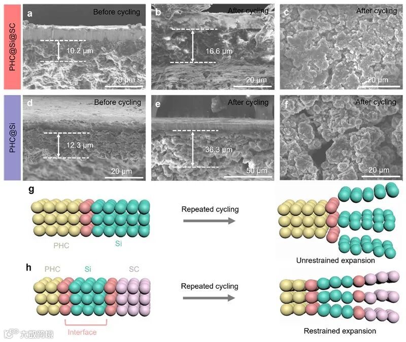 图5. (a-f) 循环后的电极表面及截面SEM图,(g-h)在长循环期间PHC@Si和PHC@Si@SC之间的差异的示意图。