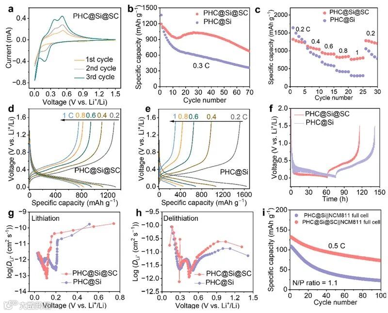 PHC@Si@SC在0.3 C的电流密度下可获得首圈容量1625 mAh g−1,首效86.8%。在倍率性能测试中,PHC@Si@SC在0.2 C时具有容量1325 mAh g−1,当电流密度升至1 C时,仍有756 mAh g−1的容量保持。良好的电化学性能反映了软碳层对提高导电性及缓解体积膨胀的重要作用。GITT测试评估了半电池中的锂离子扩散动力学。在脱锂和嵌锂过程中,PHC@Si@SC均显示出更高的锂离子转移动力学。为了证明PHC@Si@SC在LIBs中实际应用的有效性,使用NCM811作为正极材料组装了全电池。在苛刻的N/P比1.1的条件下,PHC@Si@SC||NCM811全电池提供133 mAh g−1的可逆容量,并在100次循环后具有高达56%的容量保持率。