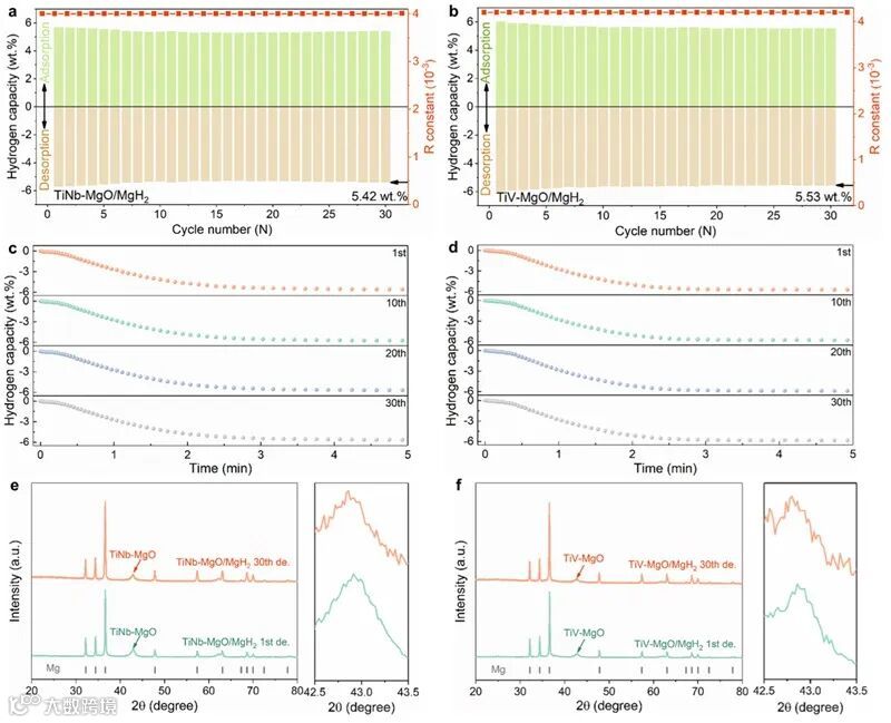 图3e和3f分别为TiNb-MgO/Mg和TiV-MgO/Mg在第1次和第30次循环后的XRD结果。研究发现,主相(Mg)和催化相(Ti