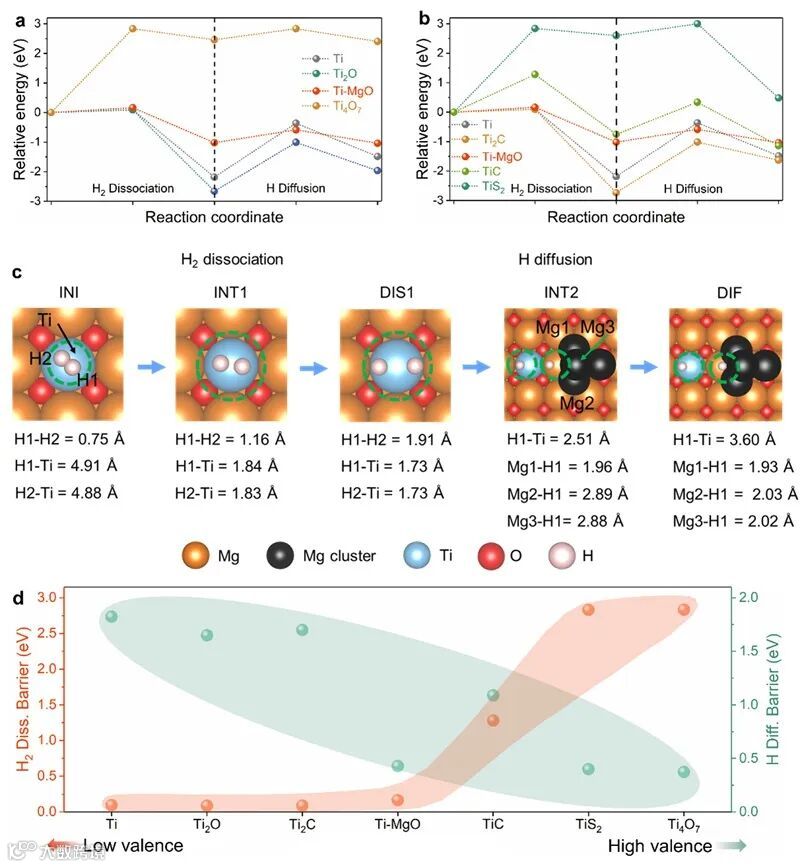 )上的吸附、解离和扩散过程,以评估Ti价态对催化过程的影响。如图5a、5c和5d所示,随着Ti价态(Ti→