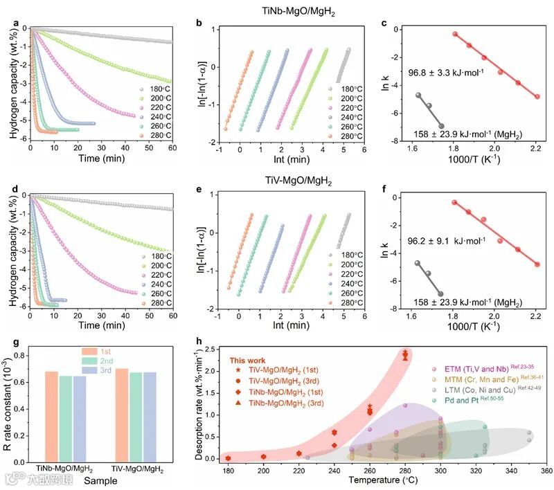 的放氢动力学对比。(e) TiNb-MgO/Mg