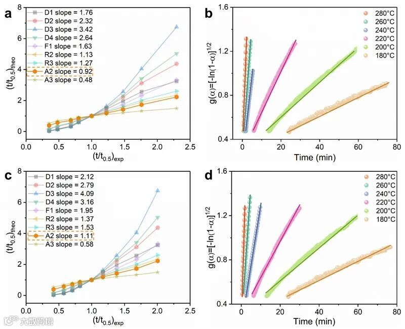 在280 ℃下的动力学模型。(b) 和 (d) 为利用A2模型对Ti