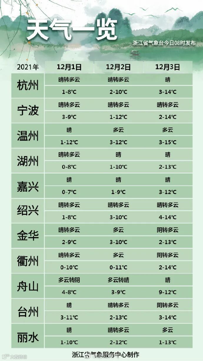 北方南下的干冷空气赶跑了阴雨,今天的天气会从阴天直接切换至多云到晴。后期到12月3日,都是晴到多云的好天气,4日和5日浙南和沿海地区会开始上云,其它地区还是维持之前的老样子。