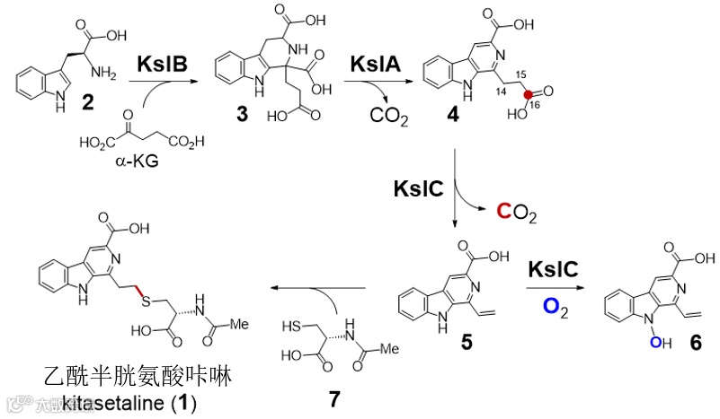 乙酰半胱氨酸咔啉的基因簇(ksl)是由日本大阪大学的Kitani教授课题组首先发现并在2019年发表于文献中。基于先前体内实验的结果,刘鸿文教授课题组的研究者在体外证明了KslB是一个皮克特-施彭格勒酶(pictet-spenglerase),其催化L-色氨酸(2)和α-酮戊二酸(α-KG)的缩合,形成化合物3。其次,KslA是一个含黄素的氧化还原酶,它催化化合物3的四电子氧化,从而形成化合物4,并释放一分子的二氧化碳。另外,KslC是一个细胞色素P450酶。体外实验证明KslC催化化合物4的氧化脱羧,生成乙烯基化合物5。KslC还可以进一步地催化乙烯基化合物5的氧化,生成N-羟基化的产物6。因此KslC是一个双功能P450脱羧酶。