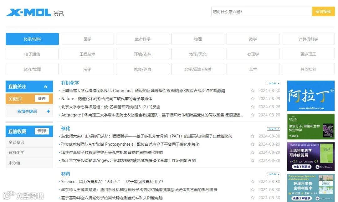 在这里你会看到诸如化学•材料、医学、生命科学等各大学科门类,点击相应学科后能看到各种前沿资讯。