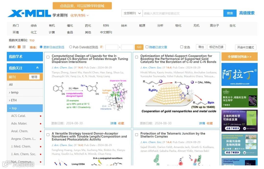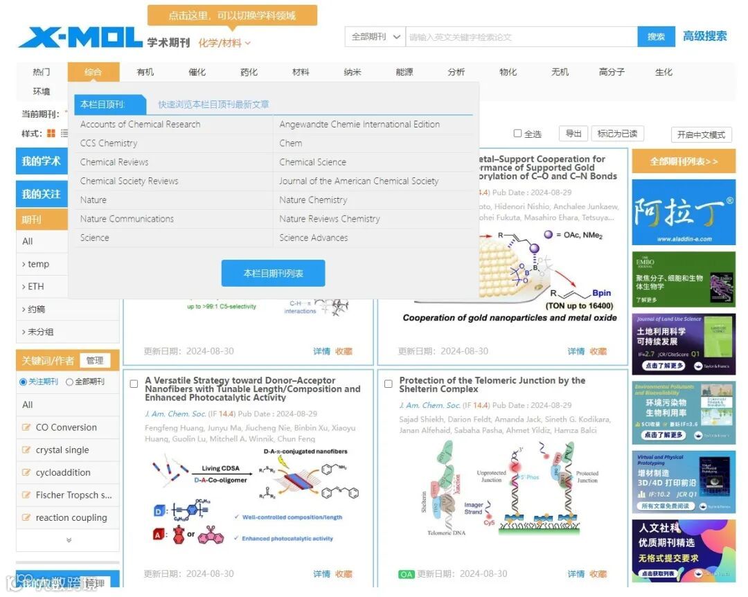 迫不及待的想看文献?点击页面顶端的“期刊”,就可以期刊文献的默认页面。下图所示,是选择“化学•材料”这个大学科门类之后的页面(医学、生命科学等其他学科同理),点击“综合”标签就能看到大学科门类下的综合性期刊,这里面就包括了无数科研工作者梦寐以求的顶级期刊,比如